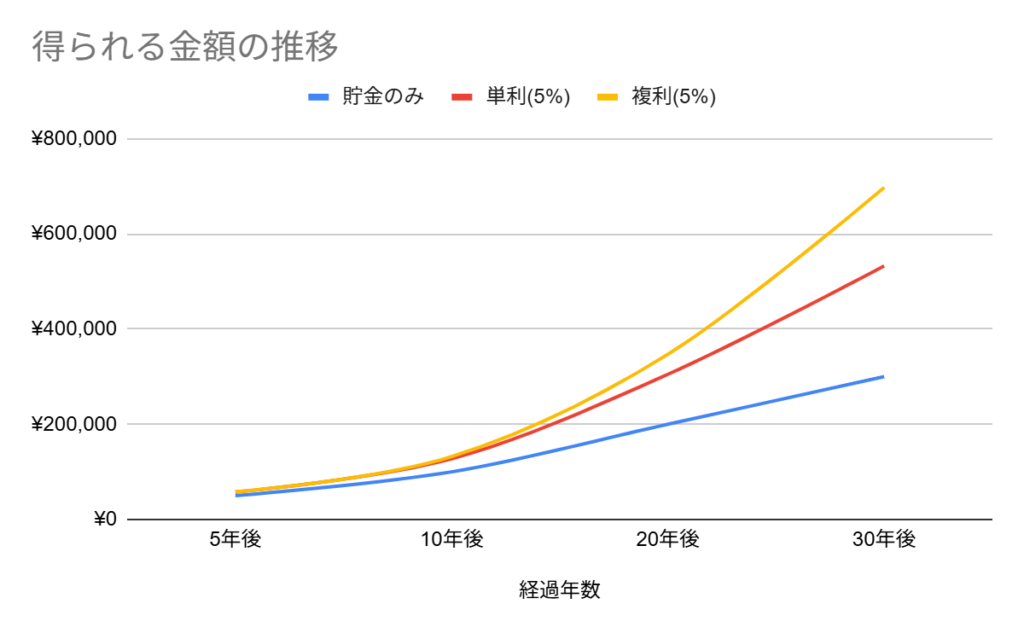 以下のグラフが、30年後までの「得られる金額の推移」である。