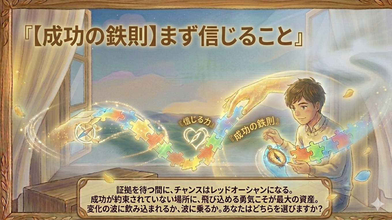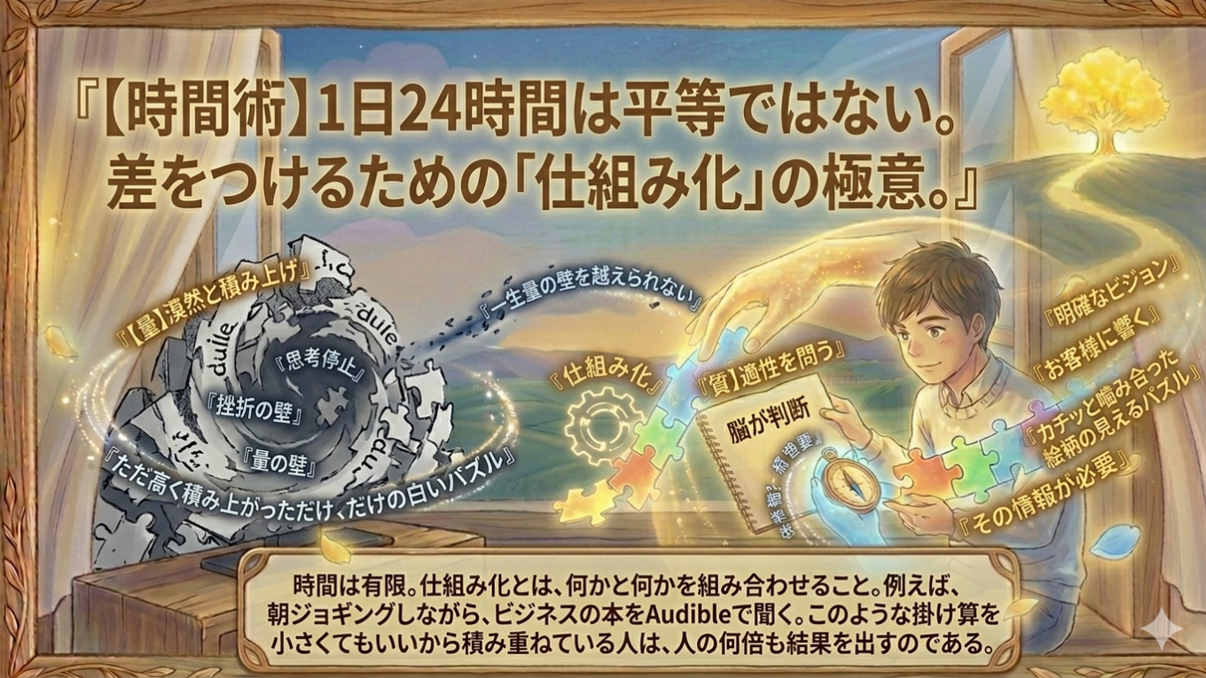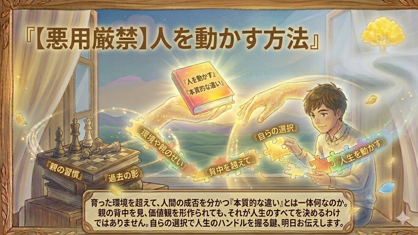 新着記事News 成功した自分へ 2026.04.13 自分 【悪用厳禁】人を動かす方法 2026.04.12 人生 【成功の鉄則】まず信じること 2026.04.11 人生 お金 人生 仕事 健康 教育 自分 人気記事Popular Post 【成功に導く仕事選び】あなたの才能を必要としている人がいる 14 views 【前編】裕福になるために「才能」は関係ない。富をもたらす“特定の方法”とは? 5 views アウトスタンディングな人生が全てを手に入れる。優秀でも意味がない 4 views 【教育】なぜ私たちは「損」だと分かっていて貯金するのか? 3 views 【DMD】あなたの努力が10倍報われる「違いをもたらす違い」の正体 3 views 【後編】黄金は「輝く顔」に集まる。富を必然的に引き寄せる4つの黄金律 3 views 食事だけで健康にはなれない。「細胞の叫び」を理解していますか? 3 views 【時間管理の秘訣】大きな差を生む時間管理 3 views Profile